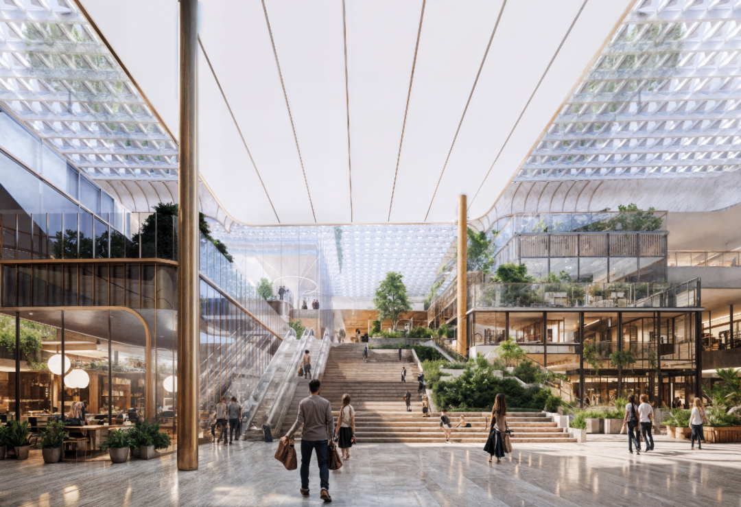 简单来讲,就是有一条绿色轴线贯穿建筑底部,从西南侧的绿地延伸进来,串联起下沉广场、商业街和屋顶平台。建成投入使用后,市民游客逛街时,沿着绿轴悠闲地“穿行”,经过“银杏山径”“绿谷”和屋顶的“云端村落”等八大空间,就像漫步在一座现代江南园林之中。