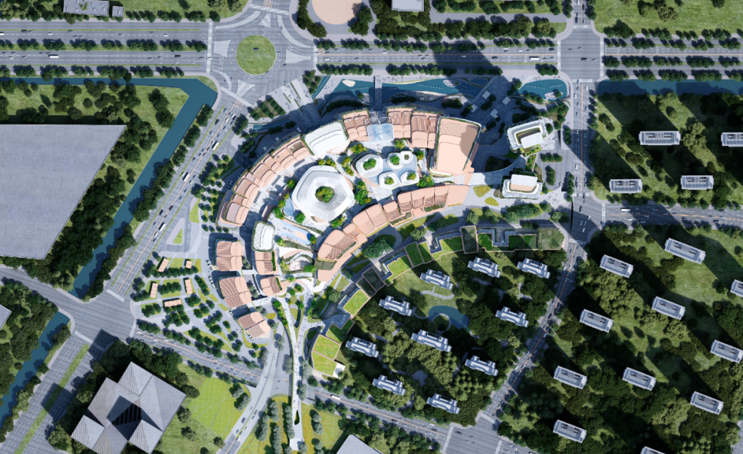 项目的整体设计由国际顶尖设计团队负责,设计理念新颖且富有潮流感,以“诗意江南,山水画扇”为创作灵感,将商业、办公与自然生态等多种功能巧妙融合。