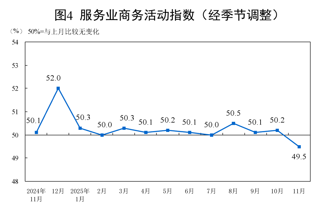 11月份,非制造业商务活动指数为49.5%,较上月下降0.6个百分点。