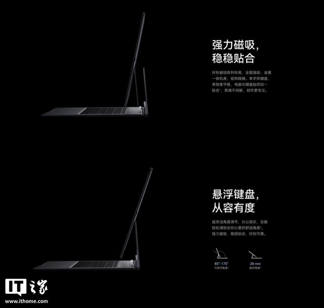 这款键盘采用环形磁铁阵列布局,实现全域磁吸效果,搭配金属一体机身设计,无论是单手拎取键盘,还是单独拿起平板,两者都能始终保持稳固贴合。它支持85°到175°的角度调节,悬浮高度达28mm。