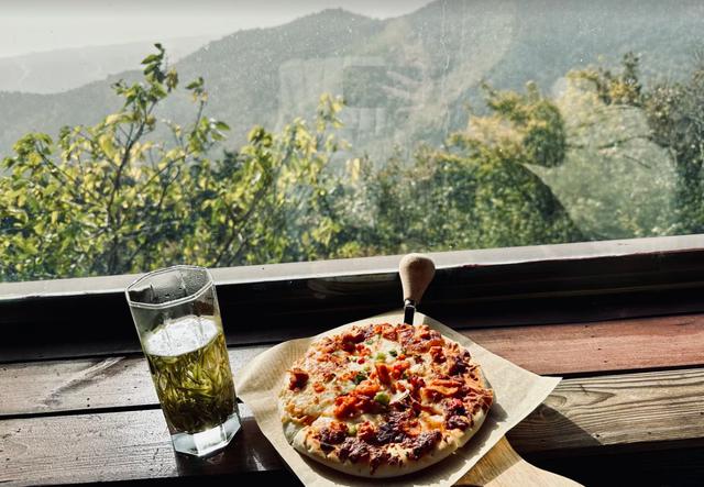 即便如此,沈佳妮还是爬到山顶,在山顶喝热茶、吃披萨,坐在窗边欣赏美景,十分惬意。