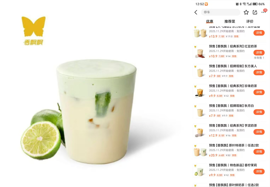 门店产品以“原叶鲜泡”为核心,涵盖原叶鲜奶茶、特调茶、鲜果茶、经典奶茶、纯茶五大系列,强调“真原叶、真茶香”。东方美人、陈皮月光白(线上爆款)、茉莉鲜橙(内测好评款)等线上口碑产品平移至线下,既降低试错成本,也试图唤醒老客记忆。