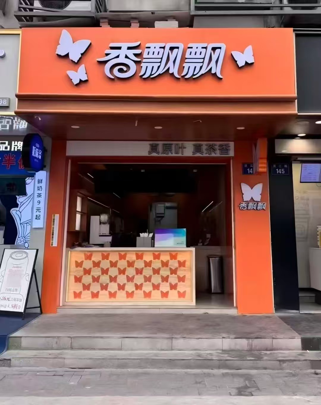价格带7.9元-16元,均价10元走亲民路线,开业有全场8折及礼品活动,如东方秋月双杯活动价13.9元。装修以品牌标志性橙色为主色调,大悦城体验店面积较大、设计时尚,融入经典杯装奶茶元素;清江路档口店面积小、无堂食,风格质朴。