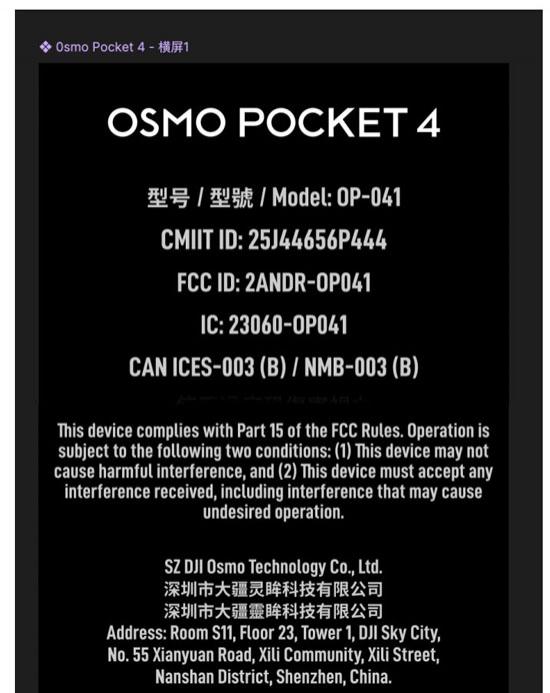科技媒体thenewcamera发布的博文显示,大疆Pocket 4已在美国FCC完成注册,数据库中的电池参数信息表明,该机型电池容量较上一代提升约20%。