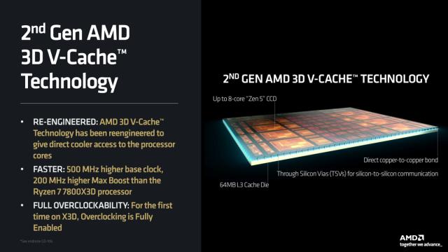 AMD方面表示,锐龙9000系列桌面处理器都应用了第二代V-Cache技术,这种新设计具有更低的温度、更高的运行效率,并且支持超频功能。