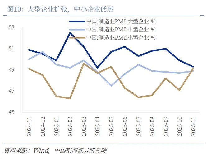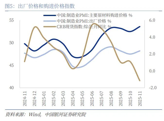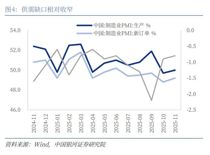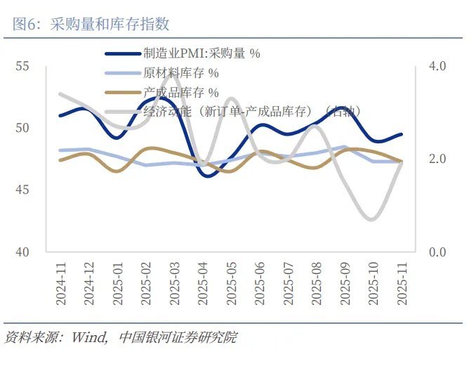 核心观点:本月制造业PMI呈现季节性回升态势,生产与新订单指数均出现回暖迹象,其中出口指数涨幅尤为显著,供需缺口收窄至0.8个百分点,显示经济已逐步企稳。特别是出口的超预期增长,或许意味着外需仍能在四季度为经济增长提供支撑。不过,当前仍存在一些隐患:产成品价格下降但原材料价格上涨的格局,依旧对企业利润形成压制;产成品库存再次下降,表明企业被动去库存的过程仍在持续,新一轮库存周期尚未开启。从分行业情况来看,有色金属行业的生产、订单、价格及库存指标均有明显上升,结合英伟达财报可知,全球AI建设热潮仍在延续;非金属矿物制品与金属制品行业的新订单量改善较为突出,这可能反映出11月基建投资有所发力,再加上年底建筑业赶工期的推动,共同促使相关指数上行。