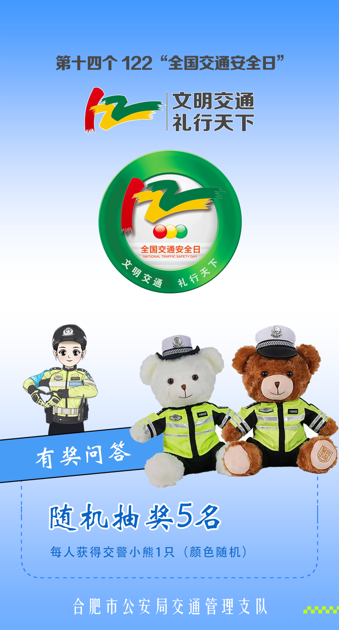 快分享给身边的亲朋好友,一起答题涨知识,赢取可爱的交警小熊吧~