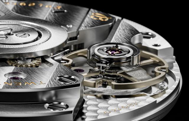机芯摆频为每小时28,800次,动力储存达78小时,配备无卡度游丝砝码摆轮。装饰上采用镂空自动陀,齿轮夹板饰日内瓦条纹,主夹板饰珍珠纹,兼顾美观与性能。