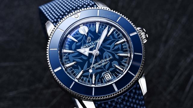 这款40毫米腕表采用深邃蓝色表盘,饰有热带树冠枝叶图案,精钢单向棘轮式旋转表圈搭配同色深蓝色陶瓷嵌件,尺寸贴合多数佩戴者需求。