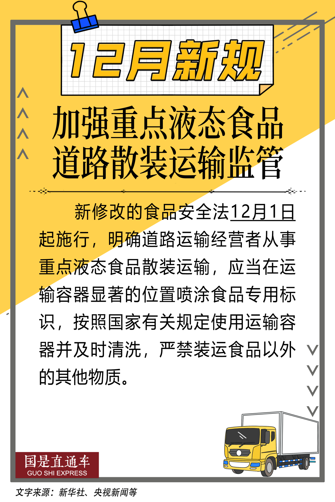 新修改的食品安全法于12月1日起施行,其中明确要求道路运输经营者从事重点液态食品散装运输时,需在运输容器的显著位置喷涂食品专用标识,按照国家相关规定使用运输容器并及时清洗,严禁用该容器装运食品以外的其他物质。