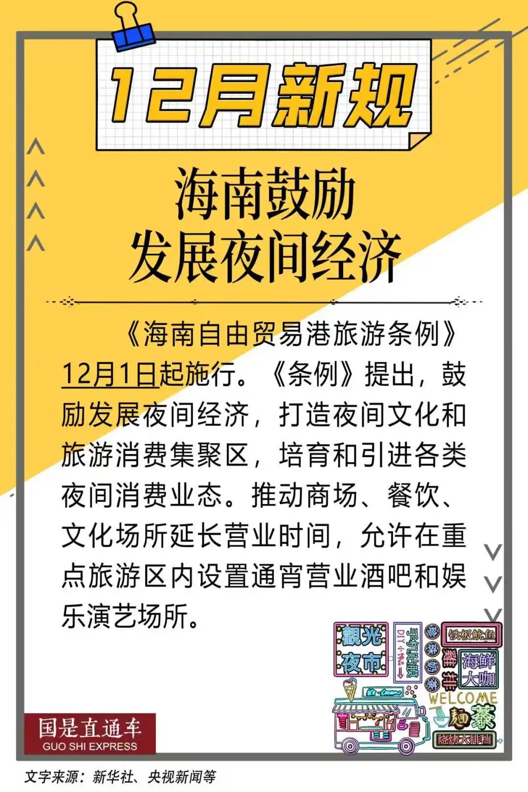 《海南自由贸易港旅游条例》12月1日起施行。条例提出,鼓励发展夜间经济,打造夜间文化和旅游消费集聚区,培育和引进各类夜间消费业态;推动商场、餐饮、文化场所延长营业时间,允许在重点旅游区内设置通宵营业的酒吧和娱乐演艺场所。