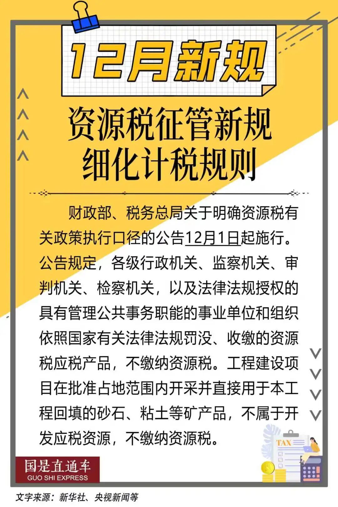 财政部、税务总局发布的关于明确资源税有关政策执行口径的公告,自12月1日起施行。公告规定,各级行政机关、监察机关、审判机关、检察机关,以及法律法规授权的具有管理公共事务职能的事业单位和组织,依照国家有关法律法规罚没、收缴的资源税应税产品,无需缴纳资源税;工程建设项目在批准占地范围内开采并直接用于本工程回填的砂石、粘土等矿产品,不属于开发应税资源,不缴纳资源税。