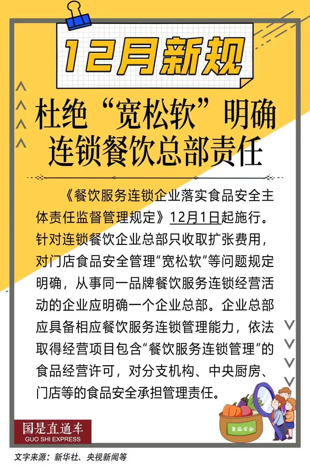 《餐饮服务连锁企业落实食品安全主体责任监督管理规定》自12月1日起施行。针对连锁餐饮企业总部仅收取扩张费用,却对门店食品安全管理“宽松软”等问题,该规定明确:从事同一品牌餐饮服务连锁经营活动的企业,应确定一个企业总部;企业总部需具备相应的餐饮服务连锁管理能力,依法取得经营项目包含“餐饮服务连锁管理”的食品经营许可,并对分支机构、中央厨房、门店等的食品安全承担管理责任。
