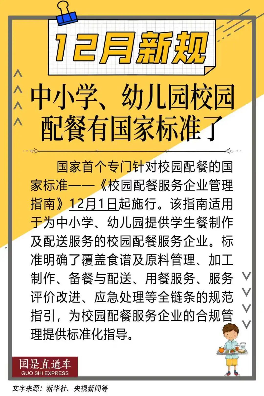 国家首个专门针对校园配餐的国家标准——《校园配餐服务企业管理指南》于12月1日起施行。该指南适用于为中小学、幼儿园提供学生餐制作及配送服务的校园配餐服务企业,明确了覆盖食谱及原料管理、加工制作、备餐与配送、用餐服务、服务评价改进、应急处理等全链条的规范指引,为校园配餐服务企业的合规管理提供标准化指导。