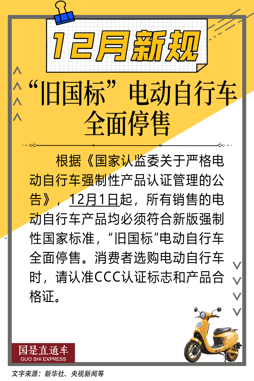 依据《国家认监委关于严格电动自行车强制性产品认证管理的公告》,12月1日起,所有在售电动自行车产品都必须符合新版强制性国家标准,“旧国标”电动自行车全面停售。消费者在选购电动自行车时,要注意认准CCC认证标志和产品合格证。