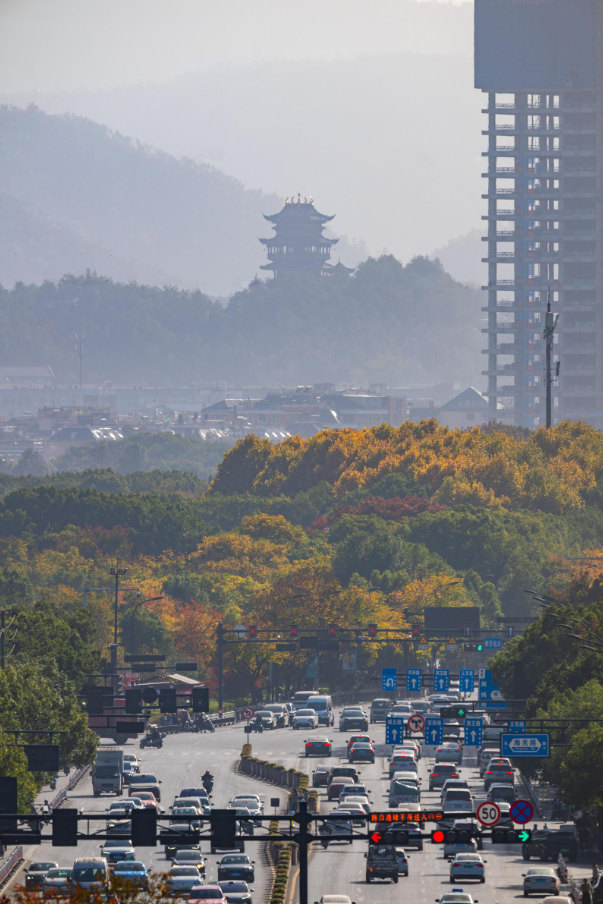 高大的红枫渐渐染上艳红,像一簇簇缓慢燃烧的炭火,温暖又惊艳视线。而梧桐树正编织着一条浪漫的“金链”……