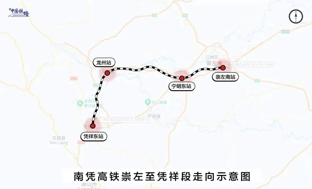 南凭高铁连接着广西壮族自治区首府南宁市与中越边境口岸城市凭祥市,项目分南宁至崇左、崇左至凭祥两段推进建设,其中南宁至崇左段已于2022年12月顺利开通运营。此次即将开通的南凭高铁崇凭段,起始于崇左南站,途经崇左市,最终抵达凭祥市凭祥东站,线路全长81公里,设计时速为250公里。全线共设有崇左南、宁明东、龙州、凭祥东站四座车站,崇左南站为既有车站,其余三座均为新建车站。
