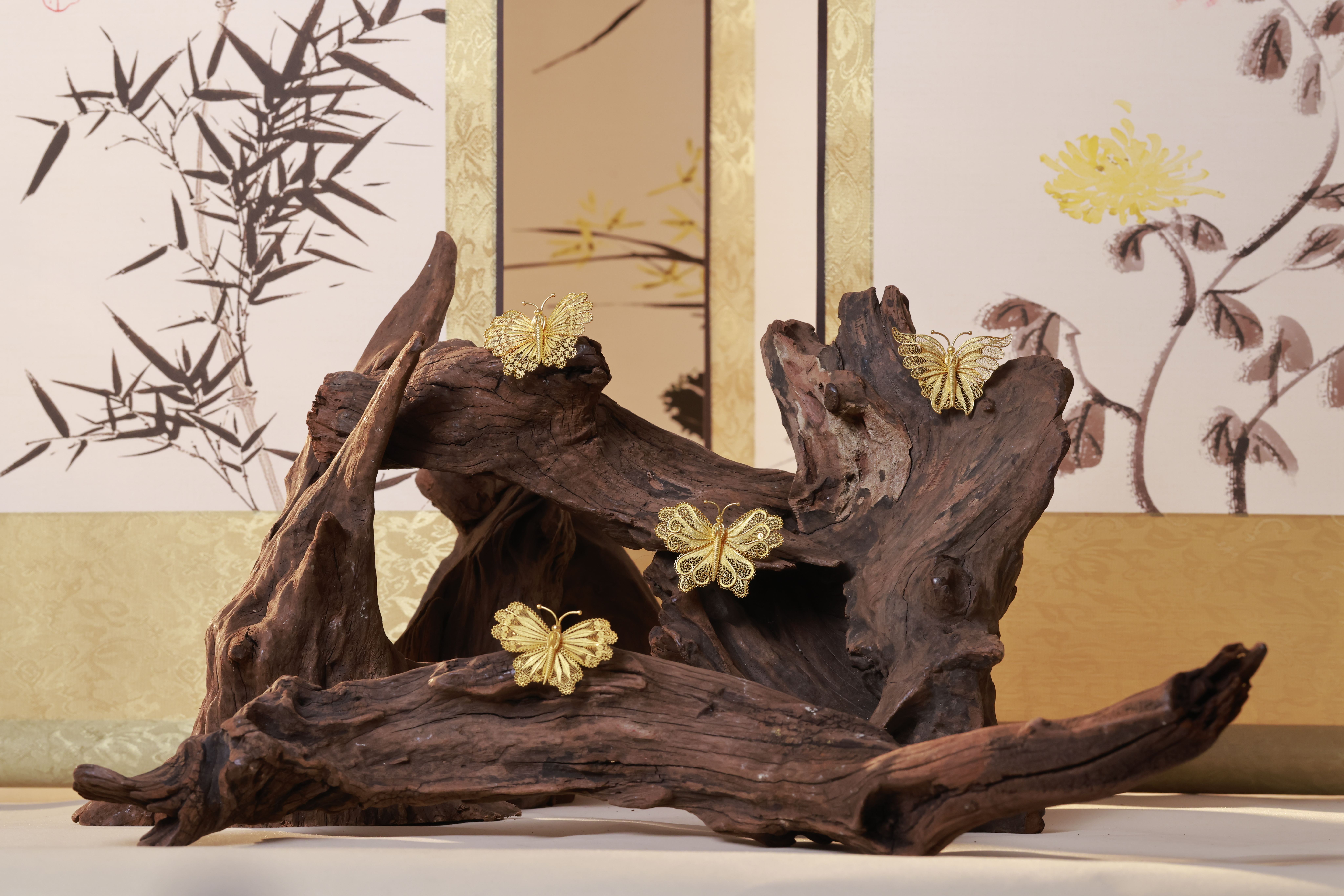 以「花丝蝴蝶胸针吊坠系列」为例,工整对称的蝴蝶造型象征结构平衡稳定与风水阴阳调和,匠人运用多种编织工艺,使单一色调的金器呈现出五彩斑斓的效果;「花开宝相项坠系列」以宝相花为设计意象,代表富贵繁盛与圣洁高贵;「宫灯耳环系列」复刻并改良自首都博物馆馆藏的「清·金质累丝宫灯状耳坠」,是花丝工艺的集大成之作,其六出脊设计寄托了人们对「六合」消灾祈福的愿望。