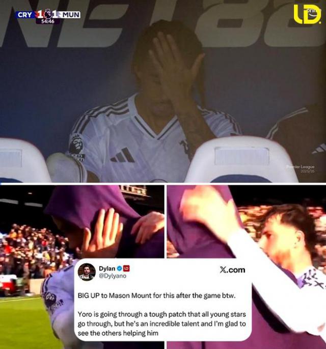 除了打入关键一球,芒特赛后安抚年轻队友莱尼·约罗的举动也广受赞誉。20岁的法国中卫不仅犯规送给马特塔点球,还有几次失误,幸好水晶宫没把握住机会,否则曼联可能不止落后一球。因此下半场初段,约罗就被阿莫林换下,坐在替补席上掩面懊悔。