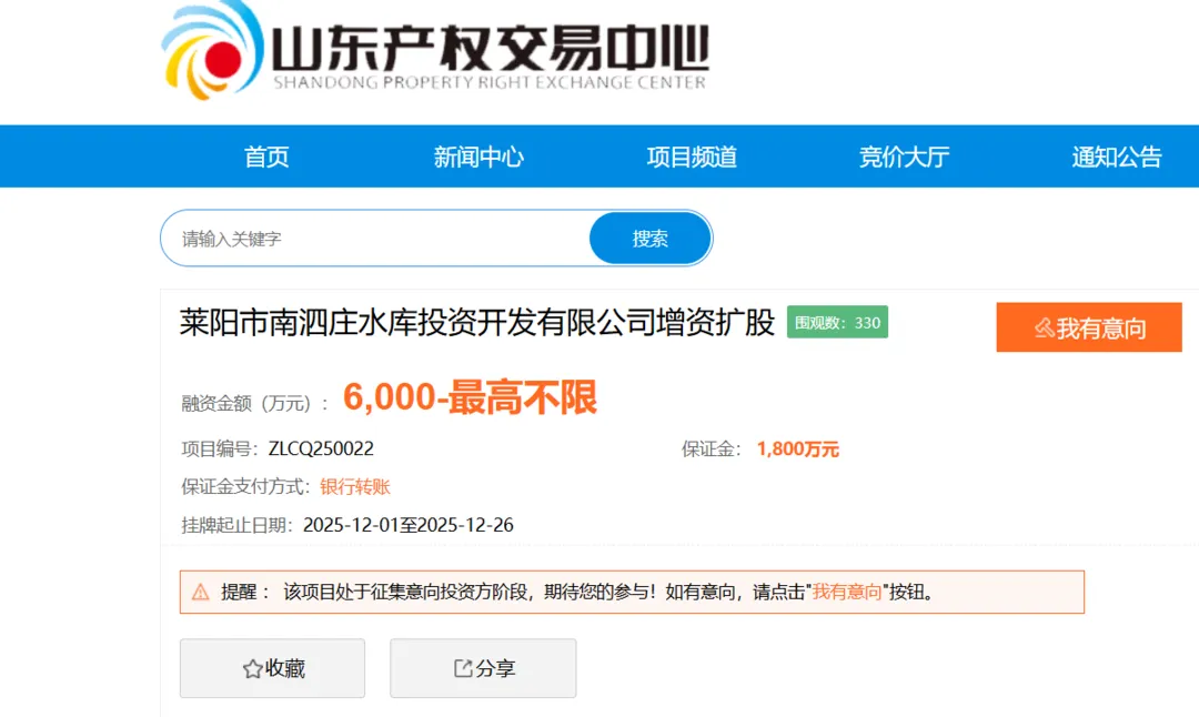12月1日,莱阳市南泗庄水库投资开发有限公司(以下简称“南泗庄水库投资”)的增资扩股项目在山东产权交易中心正式挂牌,此次融资的金额不低于6000万元。