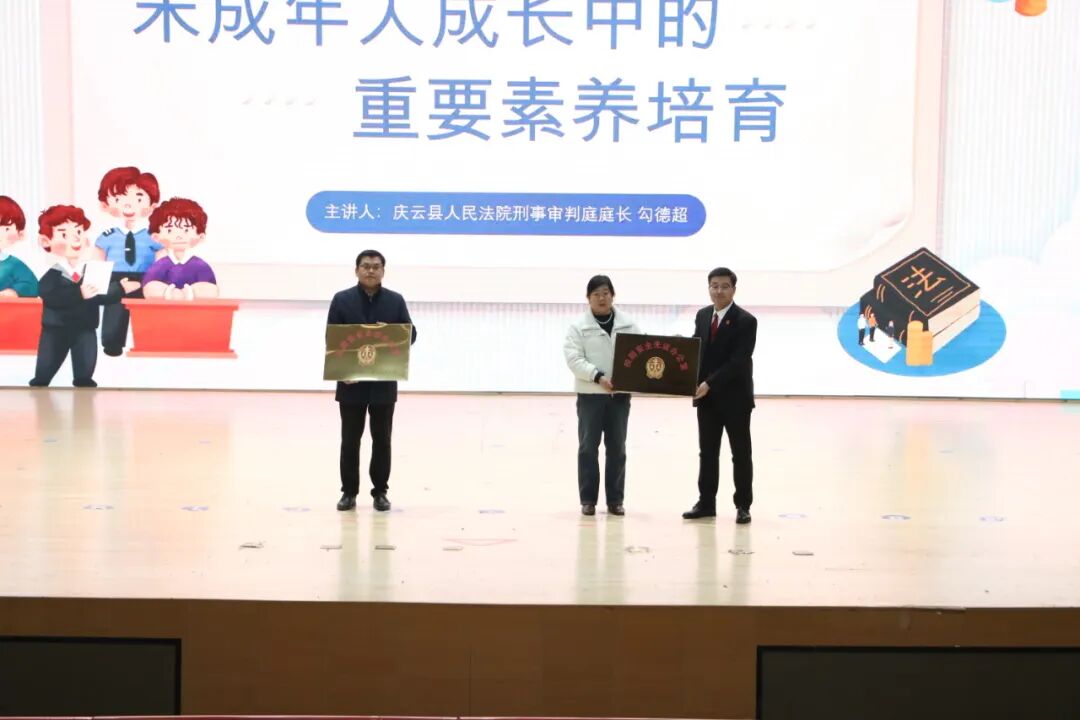 庭审结束后,庆云法院刑事审判庭庭长勾德超代表法院,分别与庆云云天中学、庆云县成德教育集团共同为“校园安全先议办公室”揭牌,进一步完善校园法治保障机制。