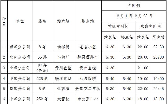 贵阳市公共交通有限公司冬季末班车时间调整表