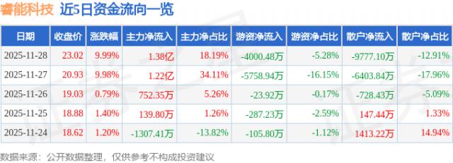 盘中异动:睿能科技(603933)12月1日早盘快速涨停