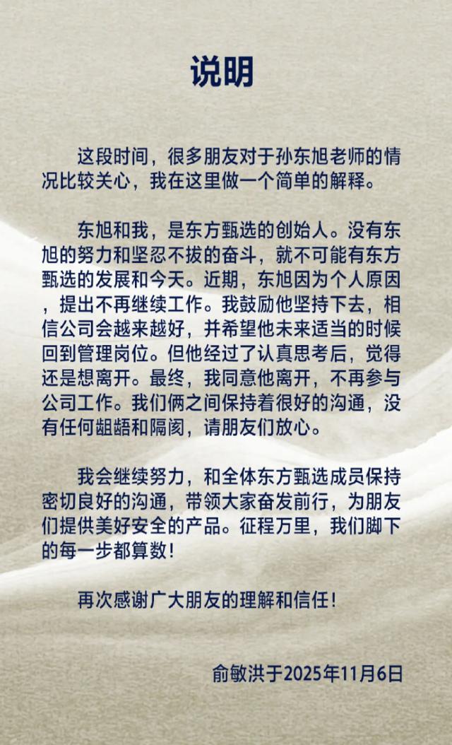 根据此前的报道,11月6日俞敏洪曾发布消息证实孙东旭已从东方甄选离职,同时他还提到两人之间一直保持着良好的沟通,不存在任何矛盾与隔阂,希望朋友们不必担忧。