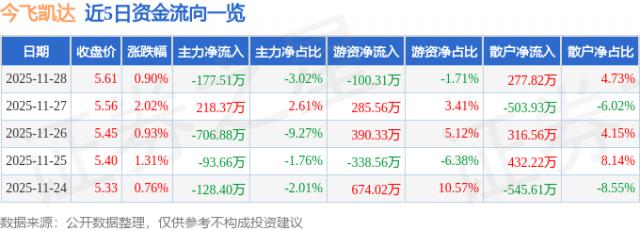 从11月28日的资金流向数据来看,主力资金净流出177.51万元,占当日总成交额的3.02%;游资资金净流出100.31万元,占总成交额的1.71%;散户资金则呈现净流入状态,金额为277.82万元,占总成交额的4.73%。