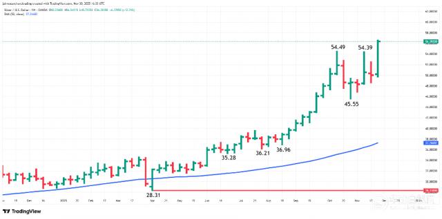 现货白银上周收盘价格为 56.39 美元,单周上涨 6.37 美元,涨幅达 12.74%。这一周,白银价格不仅实现上涨,还突破了 10 月中旬 54.49 美元的高点,随后持续上行,创下 2024 年 5 月以来的最大单周涨幅。