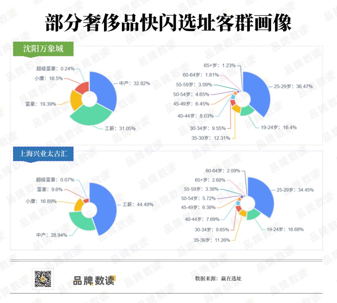 以LV今年入驻的沈阳万象城和上海兴业太古汇为例,赢在选址系统显示,这两个购物中心的客群主要为25-29岁的年轻消费者,其次是19-24岁的00后群体,且以工薪及中产消费者为主。