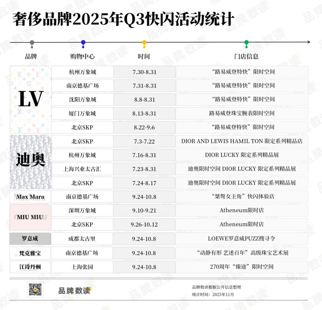 相较于高投入的大店,部分品牌选择以快闪形式在多地谨慎试水。品牌数读统计显示,仅今年第三季度,就有LV、Miu Miu等多个品牌在具有消费潜力城市的高档商圈开设精品快闪店,让当地消费者近距离感受品牌文化。