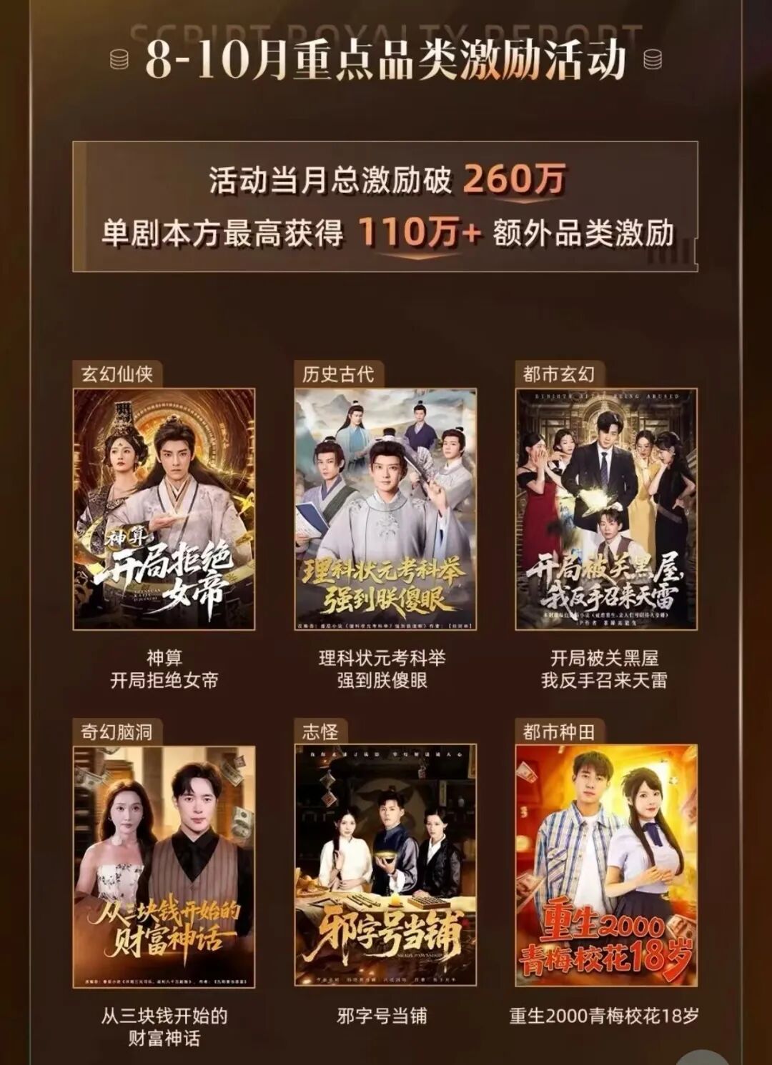 男频短剧的崛起,离不开红果平台的政策扶持。今年9月,红果推出“8-10月重点品类激励活动”,对历史古代、玄幻仙侠等六大男频核心品类进行专项分账激励,直接推动男频作品在榜单上的露出率提升,形成内容与政策的正向循环。