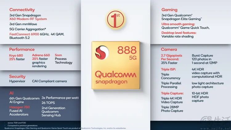 手机NPU似乎也是如此。以高通为例,2019年的骁龙855是首款公开NPU算力的产品,当时算力为7TOPs。后续的骁龙865、骁龙888、骁龙8 Gen1官方均公布了算力数据,分别为15TOPs、26TOPs、52TOPs。