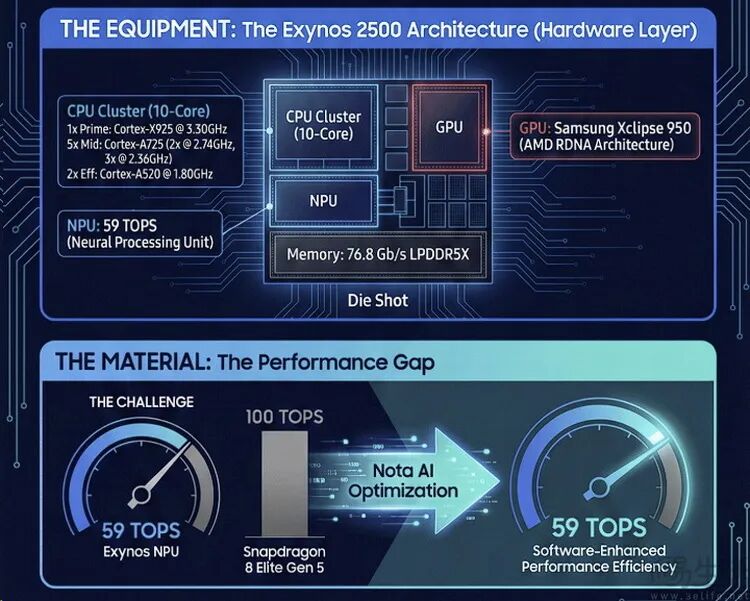 对更多品牌而言,与大模型开展技术合作,深度调校AI功能在NPU上的兼容性和执行速度,是当下提升NPU性能的主要方式。例如,近日三星与Nota AI达成合作,计划通过软件优化让Exynos 2500的NPU(算力59TOPs)在实际AI执行速度上“追平”第五代骁龙8至尊版的100TOPs算力NPU。