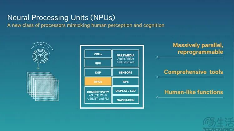 例如,早期“手机AI”几乎集中在“计算视觉”领域,如面部识别、拍照自动场景优化、视频自动画面增强等。这些技术需要NPU具备强大的图像信号吞吐量,因此最早的NPU完全聚焦于“峰值算力”,追求在最短时间内完成计算。由于NPU平时很少参与手机日常工作,能效比稍差也无关紧要。