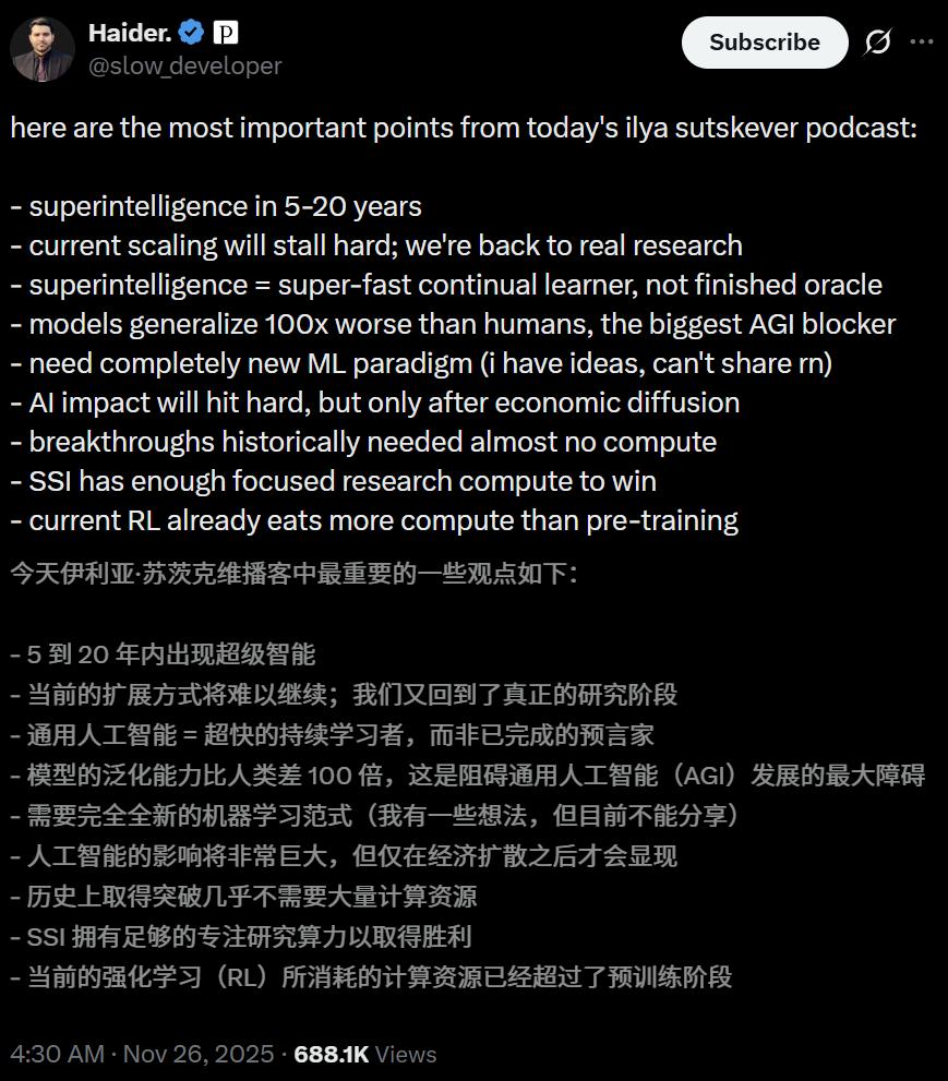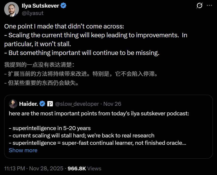 从Ilya此前的播客对话中,或许能找到关于‘关键缺失’的线索。
