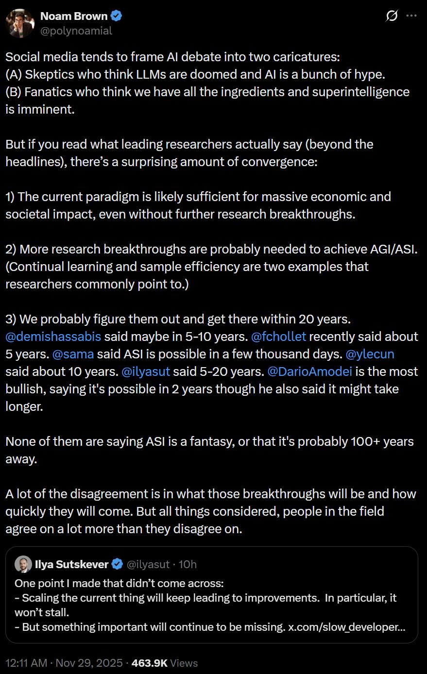 2. 要实现AGI/ASI,还需更多研究突破(‘持续学习’与‘样本效率’是研究者常提及的例子);