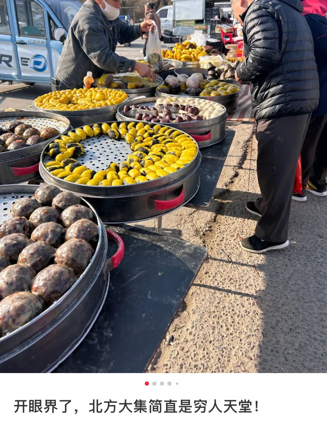 除了情绪价值,亲民物价也是集市的吸引力。现在消费刺客多,雪糕、水果都能藏高价,超市低价商品变少,外卖也吃不起了。但集市不一样,曹洼大集5毛一个的油煎包、20元一碗的全羊汤,北京集市10块钱能买汤面、草莓或两件衬衣,东北集市1元的油炸糕、5角的大白菜,让年轻人有“财富自由”的错觉。