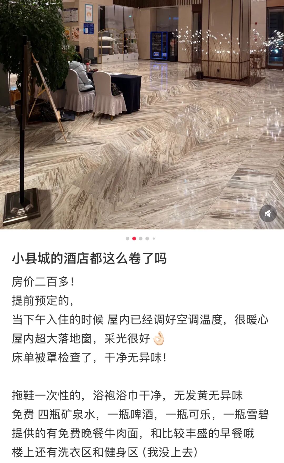 近两年,年轻人周末爱去小县城。这里酒店堪比五星却只要二百多,还有免费泳池;10元3两的牛肉面、5块钱的面包片,100元能买一个月的菜,西瓜6毛一斤,比一线城市便宜近10倍。马术、网球这些中产运动也能随便玩,不用排队还实惠。