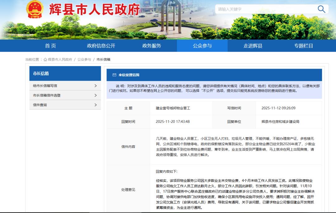 几天后的11月20日,辉县市住房和城乡建设局回复称,该项目物业公司因多数业主未交物业费,已4个月未发工资,导致员工辞职,服务停摆。