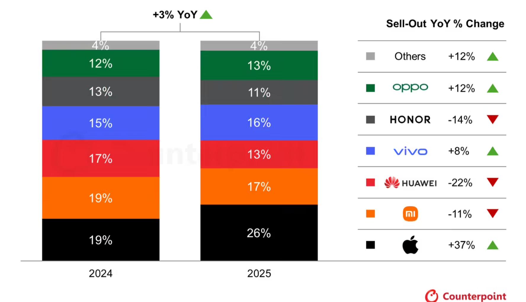 CounterPoint的数据与预期有不小出入,比如苹果销量增长超37%。虽早料到苹果表现不会差,但今年苹果限价严格,降价力度远不及往年,如此高增长确实意外。