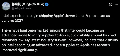 若进展符合预期,苹果计划最早在2027年第二至第三季度,由英特尔采用18AP制程代工其最低端的M系列处理器。