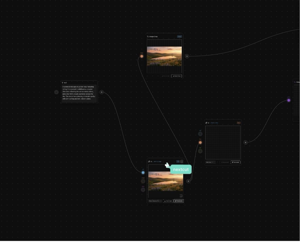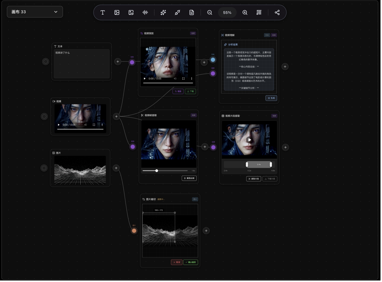 和传统剪辑软件单一的线性轨道不同,NextCut AI进入市场的核心逻辑是对交互形式的重构。团队将其称为“视频创作界的Cursor”,首创了“无限画布×workflow”的形态,打破了时间轴的物理约束。在实际操作中,创作者可以在画布上以节点形式管理故事板、Prompt逻辑和多模态素材。