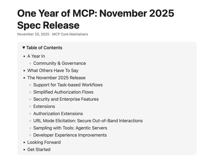 11月25日,Anthropic官方博客发布了一篇周年庆文章,宣布MCP正式迎来一周岁生日,同时推出了新版规范。