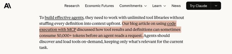Anthropic自己也承认了这一问题。他们在博客中写道,当Agent需要读取一份两小时的会议文档时,可能要额外处理50000个Token,更大的文档甚至会直接超出上下文窗口限制,导致整个工作流崩溃。