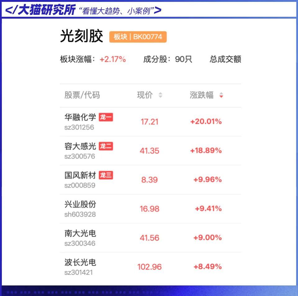 市场担忧情绪升温,推动今日光刻胶板块走强: