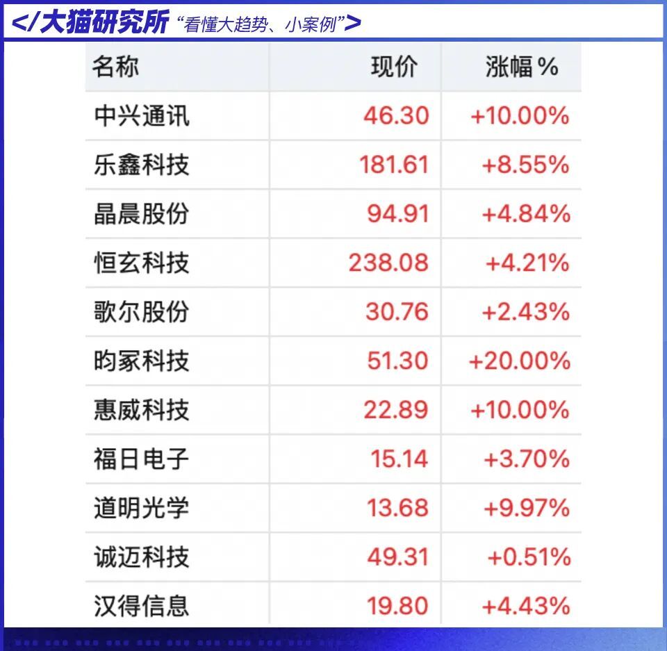 AI手机、AI眼镜等消费电子板块今日大涨。周末市场情绪已提前酝酿,早盘猫哥在星球内对此做过分析,板块全天走势强劲。