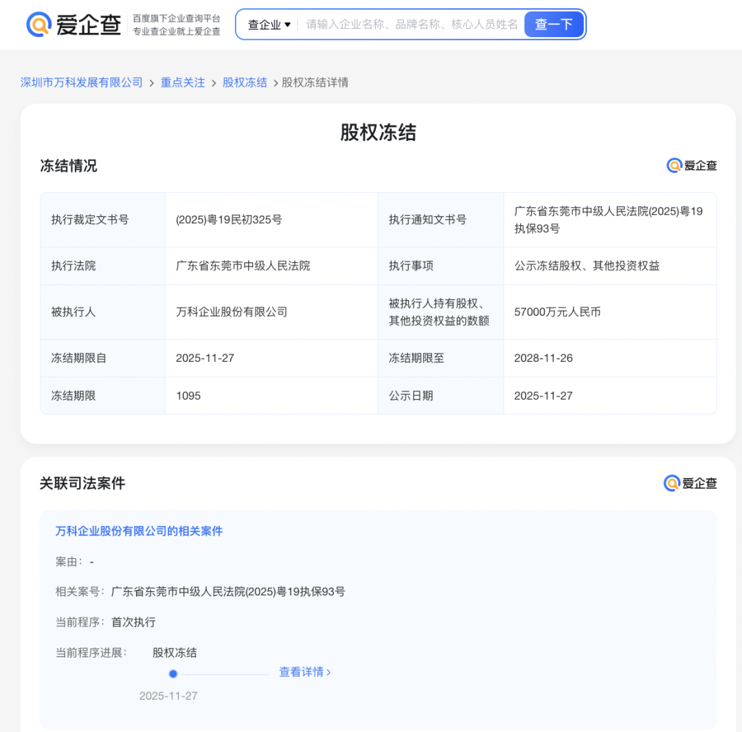 爱企查的风险信息显示,近日,万科新增了一则股权冻结信息,被冻结股权所属的企业是深圳市万科发展有限公司,冻结的股权数额为5.7亿元,冻结期限为3年,执行法院是广东省东莞市中级人民法院。