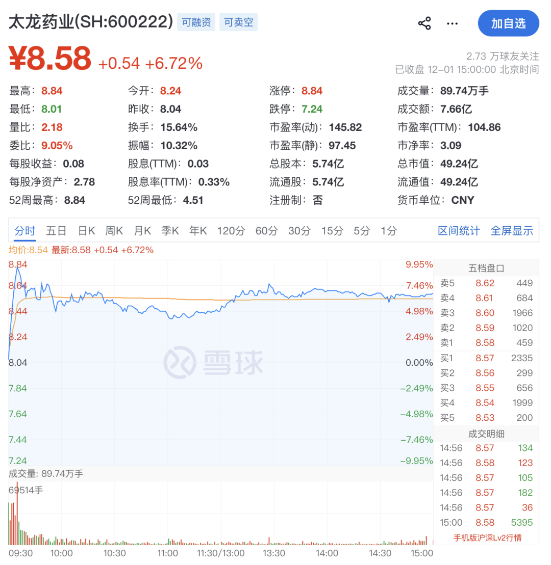 截至12月1日收盘,太龙药业的股价为8.58元/股,公司总市值为49.24亿元。